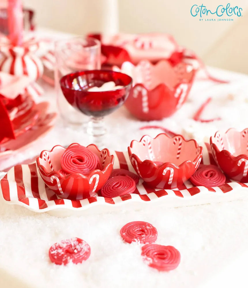 Functional, stylish, and versatile, our Red Stripe Ruffle Skinny Tray is a must-have for any host. The balanced red and white striped pattern and ruffled edge create a playful oblong tray. Serve guests hors d’oeuvres with drinks on this serving platter or use it to corral remotes in the living room—the choice is yours. Add a touch of sophistication to your table with this striped skinny tray.