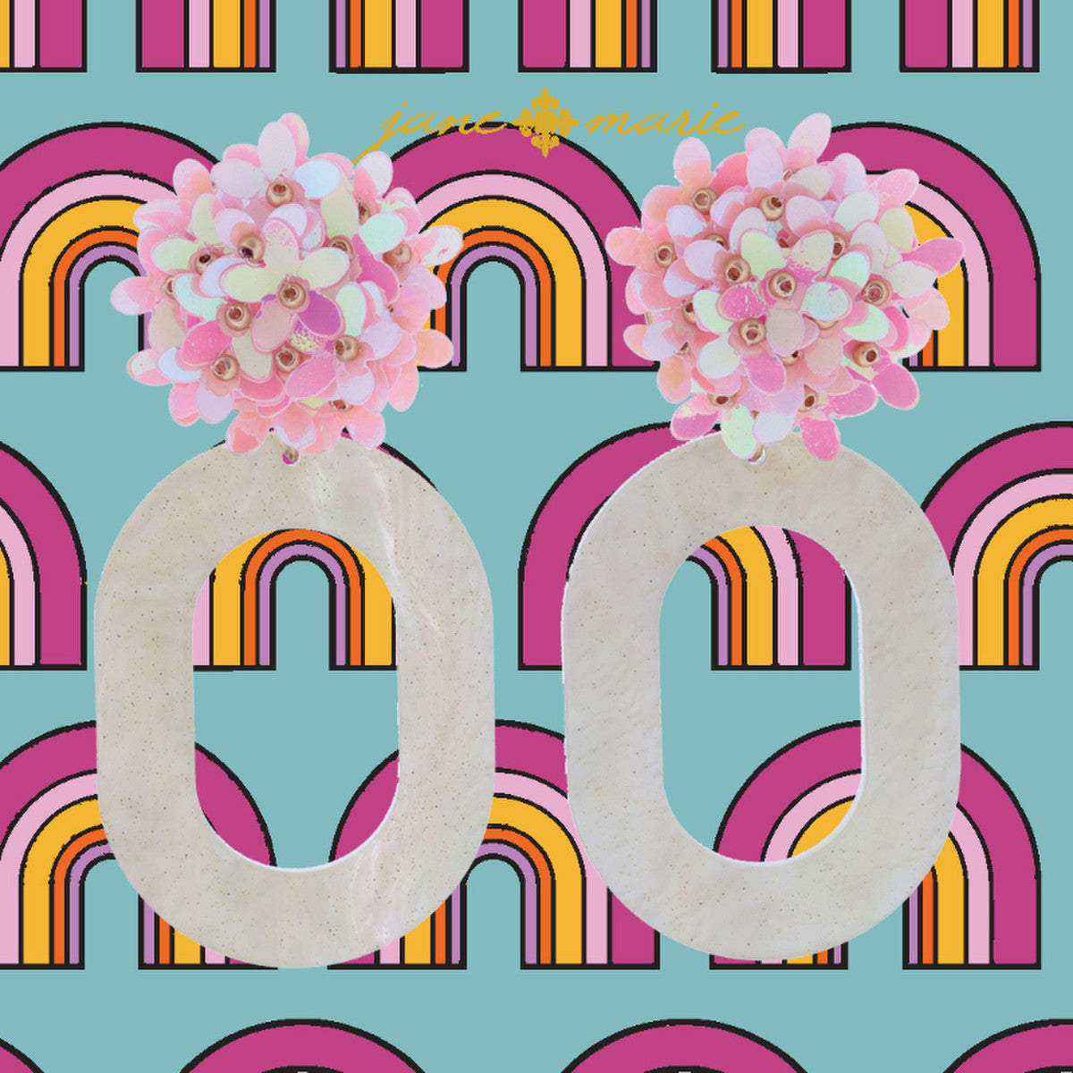 IRIDIESCENT PINK SEQUIN FLOWER POM POST WITH PEARLESCENT RESIN OVAL EARRINGS