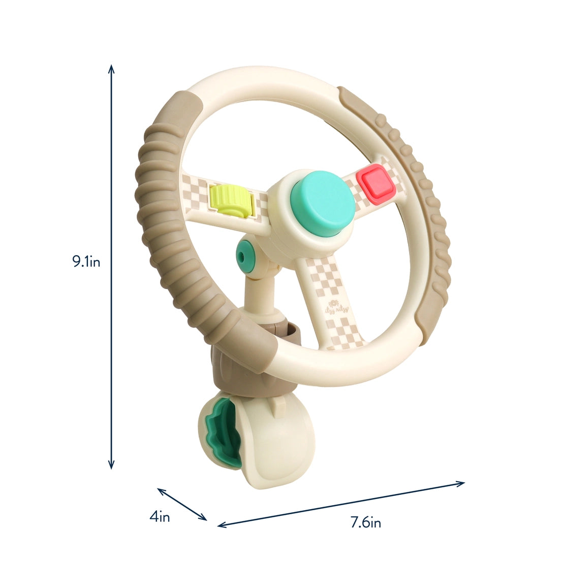 Travel = playtime with this spinning steering wheel made for little racers - Three built-in fidgets keep baby busy while you do you - Adjustable clip fits most strollers, wagons and shopping carts. Versatile and adorable.