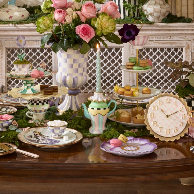 Illuminate your spring table with the Violet Teapot Candle Holder, featuring a colorful hand-painted teapot-shaped base with a handle and spout. Holds one of our standard dinner candles.
